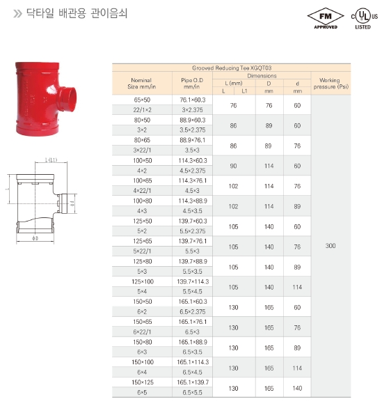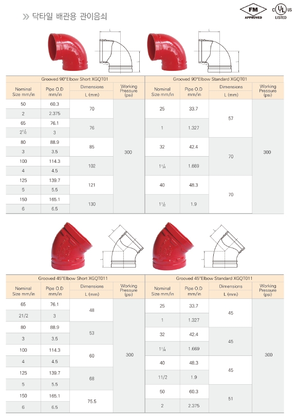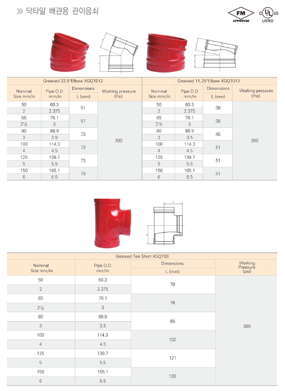 - 90도엘보, 45도엘보, 티, 레듀싱 티, 동심 레듀샤, 편심 레듀샤, 캡, 프랜지, 프랜지 아답타, 그외 그루브 모든피팅은 사전에 그루브 가공되어 손쉽게 설치가 가능한 상태로 공급됩니다